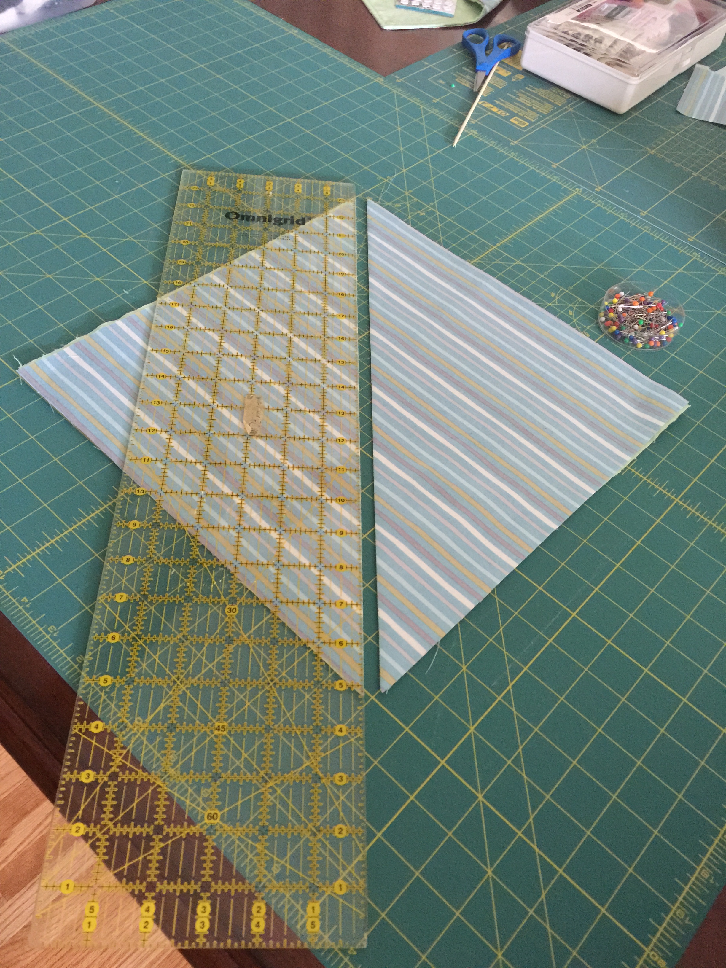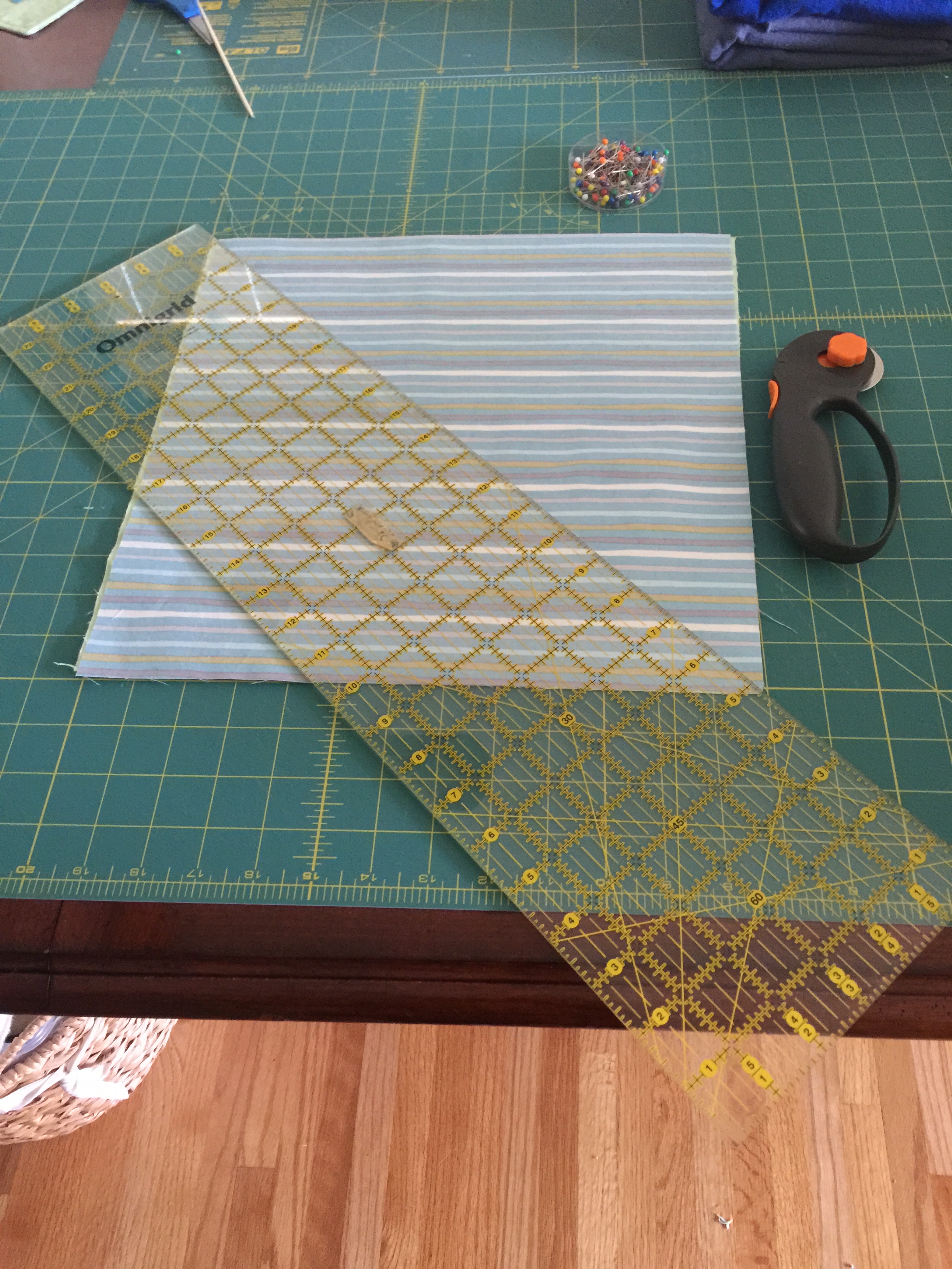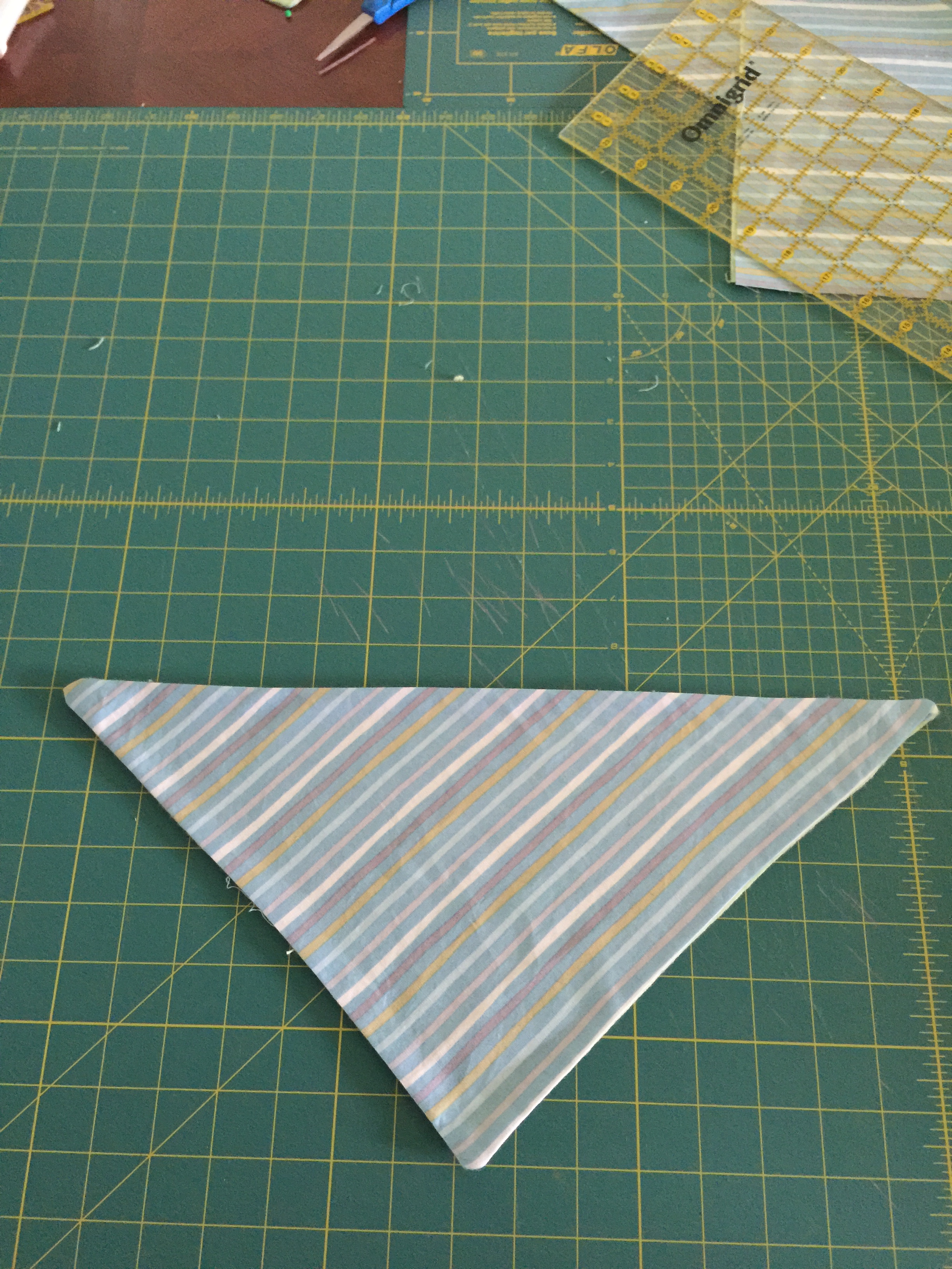 Cut fabric on a diagonal.